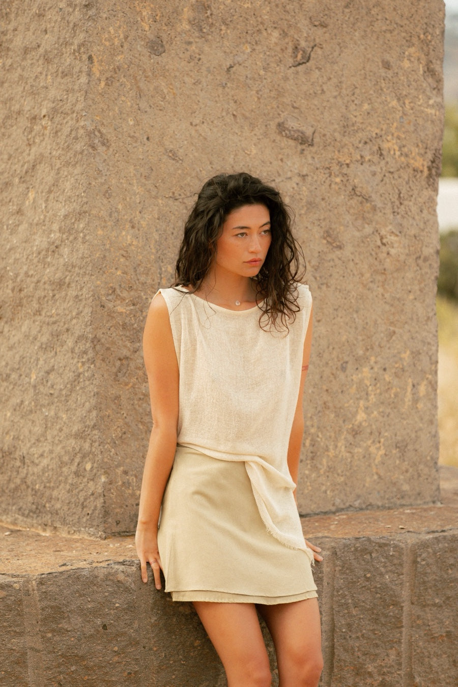 Elevate your style with the myrrh mini skirt, featuring a flattering A-line silhouette crafted from hand-loomed raw silk and organic cotton in natural tones. The high-waisted design cinches in your waist for a feminine and empowering look. Made with 100% handloom raw silk and organic cotton, this skirt embodies a harmonious blend of luxury and sustainability, promoting both style and well-being.